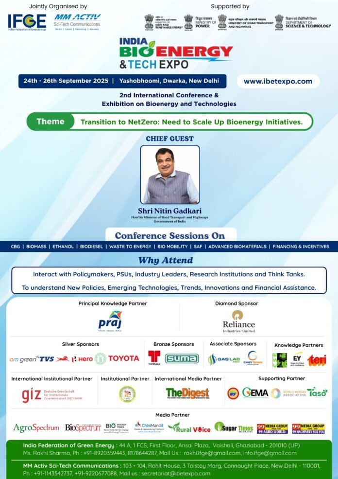 will feature a comprehensive Exhibition and an International Conference on Bioenergy and Technologies, centered around the theme: “Transition to Net Zero: Need to Scale up Bio-energy Initiatives.” The Expo will focus on key sectors including Compressed Biogas (CBG), Ethanol, Bio-Diesel, Waste to Energy, CCUS, Bio-Mobility, Sustainable Aviation Fuel (SAF), Biomass Pellets and Briquettes, among others. It will serve as a platform to showcase the latest technologies, machinery, equipment, innovations, products, services, and cutting-edge R&D in the bioenergy domain.