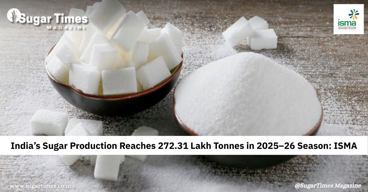India’s sugar production has increased by about 9% in the ongoing 2025–26 sugar season, reaching 272.31 lakh tonnes as of March 31, 2026, according to the Indian Sugar and Bio-energy Manufacturers Association. During the same period last year, production stood at 248.78 lakh tonnes, indicating improved output across major sugar-producing regions.